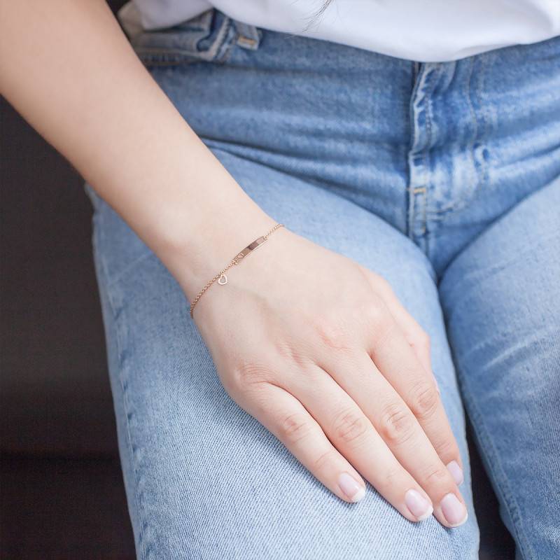 Ce bracelet issu de la nouvelle collection pour enfant est plein de tendresse et de douceur. Le bracelet, d'une longueur de 17,50 cm, est conçu en or rose 750/1000 (18K) accompagné d'une finition polie. La chaîne est de type maille forçat ronde de 1 mm de largeur et dispose d'un anneau de réglage à 15,50 cm. Le centre se compose d'une plaque incurvée et ajourée d'un petit coeur sur le côté. La plaque, aux dimensions de 4 x 20 mm, est suivie d'une pampille en forme de coeur ajourée et suspendue à la chaîne. Le coeur mesure 5 mm de diamètre. Le bijou est composé d'un fermoir mousqueton ainsi que d'une pampille sur laquelle une gravure apparaît " Kids - Caterina B ". Le bracelet pèse en moyenne de 1,53 gramme.