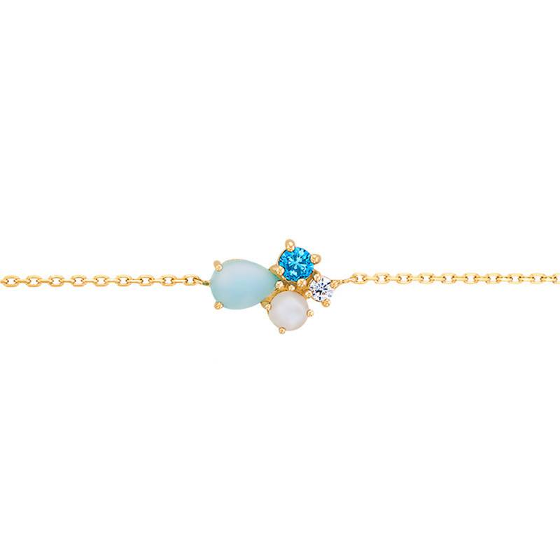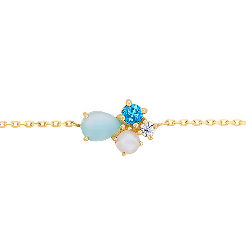 Craquez pour ce bracelet en plaqué or jaune 3 microns, très élégant et très contemporain. Ce bijou est l'accessoire indispensable pour un style chic. Ce bracelet, d'une longueur de 18 cm, viendra habiller gracieusement votre poignet. Habillé de 4 pierres différente sur le haut de son bracelet, il est lumineux et coloré pour un rendu unique. Oxydes de zirconium blancs et bleus se mélangent aux verres colorés roses et bleus. C'est un fermoir mousqueton pour une plus grande sécurité qui vient terminer cet ensemble.