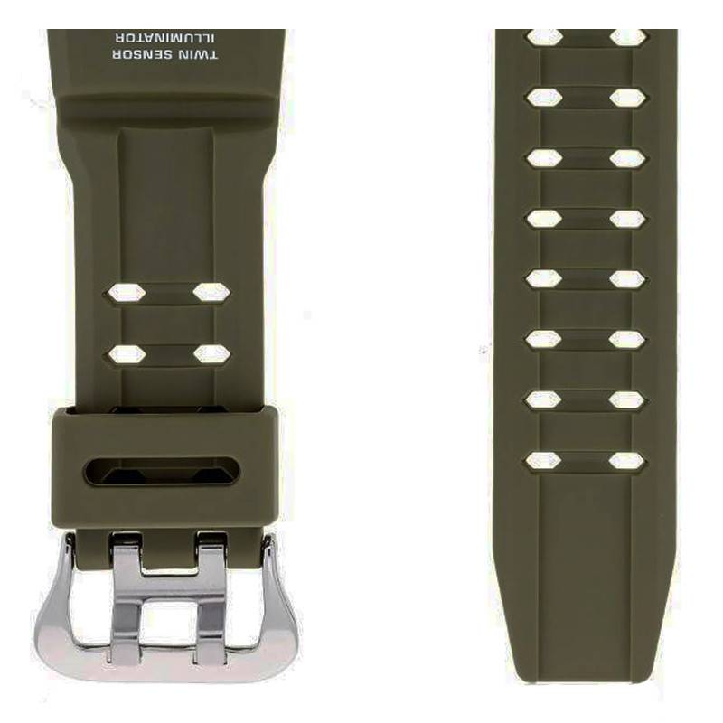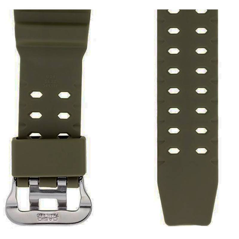 Ce bracelet en résine vert est extrêmement durable et flexible. Il est spécialement conçu pour les montres G-shock de Casio de la collection GA-1100KH. Il est doté des trous de forme hexagonale à double rang. De plus, un passant de même couleur que le bracelet et ajouré permet au bon maintien du bracelet autour de votre poignet. Son étanchéité est inscrite sur la partie supérieure du bracelet en lettres blanches. Il pourra donc vous suivre dans votre quotidien, que vous soyez aventurier ou non !