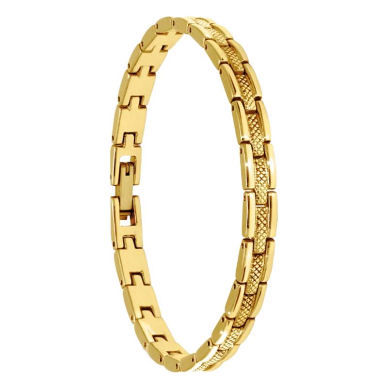 Brillant, ce bracelet de la collection Santorin, illuminera votre look en vous ajoutant un éclat audacieux. Il est conçu en acier inoxydable et arbore un traitement en PVD jaune qui lui confère une couleur jaune doré sophistiquée. Sa longueur de 21 cm est ajustable vous assurant un port confortable et au gré de vos envies. Ce bracelet se compose d'une chaîne à maillons en Y ou chaque maille a des bords polis et un centre strié pour un rendu décoratif agréable à voir. Doté d'une largeur de 6 mm, ce bracelet se termine par un fermoir clipable.