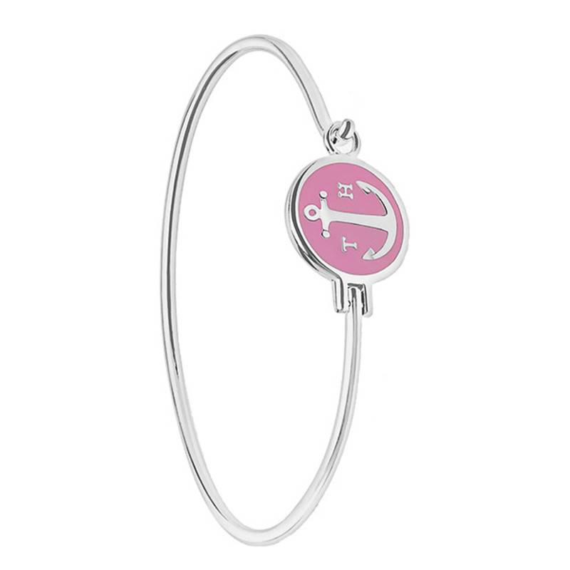 Laissez-vous séduire par ce charmant bracelet de type jonc. Il a été réalisé en laiton plaqué argent pour scintiller de mille feux pendant des années. Au centre, on retrouve une pierre de couleur rose qui apporte de la féminité à ce bijou. Sur cette pierre est gravé l'emblème de la maison qui n'est autre que l'ancre. Il est disponible en taille S et en taille M. Enfin, sachez qu'il s'attache à l'aide d'un fermoir crochet.