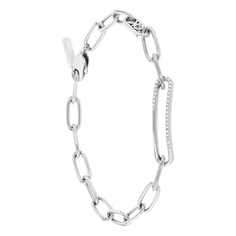 Ce joli bracelet Timeless est sélectionné parmi les modèles de la collection Asymmetrical Elegance qui incarne la beauté minimaliste et épurée. Il est conçu en acier inoxydable de couleur argentée et se compose d'une chaîne en maille allongée mesurant 18,50 cm ajustable. Raffinée, celle-ci soulignera subtilement le charme de votre poignet. Elle est magnifiée par un maillon plus allongé et arrondi qui est rehaussé par des pierres rayonnantes. À quelques maillons de celui-ci se trouve une maille allongée et large portant les initiales de la marque gravées en creux. À noter que ce bracelet possède un fermoir mousqueton décoré par une plaque rectangulaire signée.