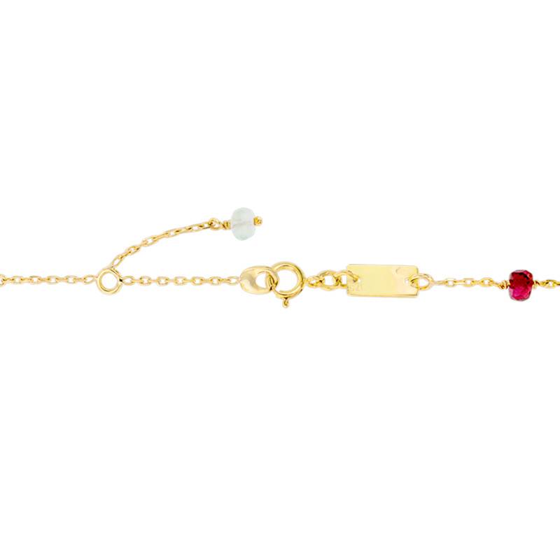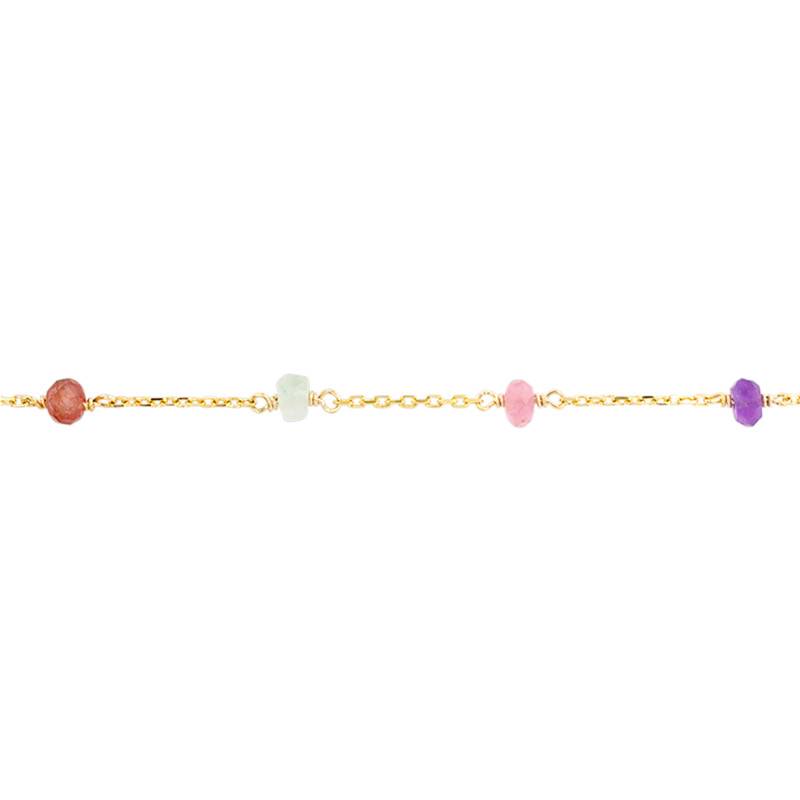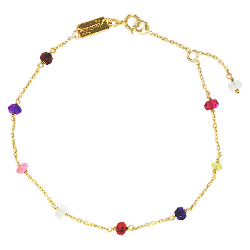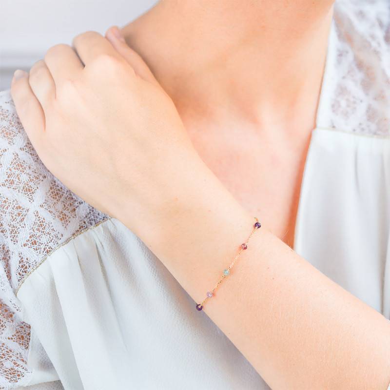 Ravissant bracelet en or jaune 375/1000 (9K) composé de 9 pierres fines : 5 tourmalines roses, 1 tourmaline verte, 2 améthystes et 1 péridot.