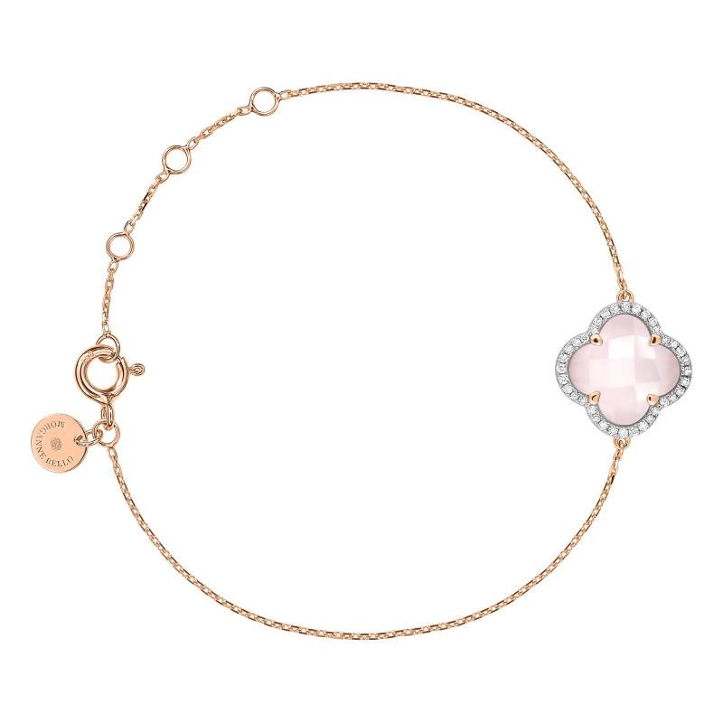 Voici un magnifique bracelet émanant de la collection victoria. Il est réalisé en or rose 750/1000 (18 K) ce qui lui confère ce joli ton rosé. Cet ornement à l'allure attrayante sera du bel effet sur votre main. Il se pare d'une fine chaîne en maille forçat qui moulera votre poignet avec splendeur. De plus, celle-ci arbore sur un serti à griffes un ravissant quartz rose milky de 3,55 cts. Cette gemme est accompagnée d'un pavé de diamants de 0,128 cts reprenant la taille florale de cette dernière. Radieuses et éclatantes, ces pierres apportent à ce bracelet une touche incroyablement resplendissante. Notez que ce dernier affiche une longueur de 17 cm avec quatre anneaux qui vous permettront de l'ajuster à la taille qui vous conviendra grâce à son fermoir anneau à ressort.