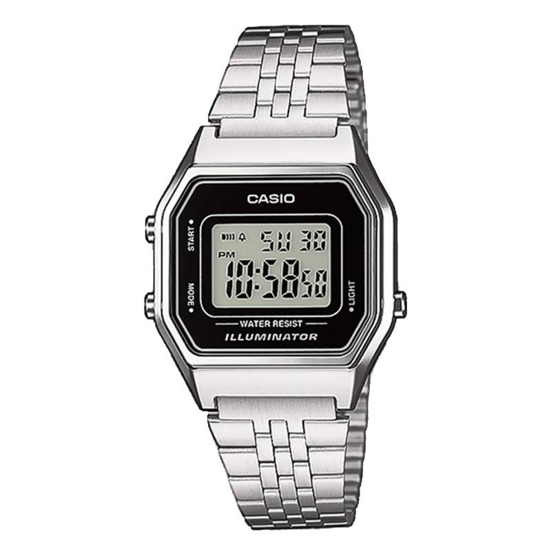 Cette montre à quartz avec un cadran à cristaux liquides présente un bracelet en acier argenté et un boitier en résine avec un fond noir. Le cadran est noir et gris. Elle possède les fonctions d'alarme quotidienne, chronométrage au 1/100e de seconde et calendrier automatique. Elle n'est pas étanche mais résiste à des projections d'eau, ainsi il faut éviter la douche ou la vaisselle.