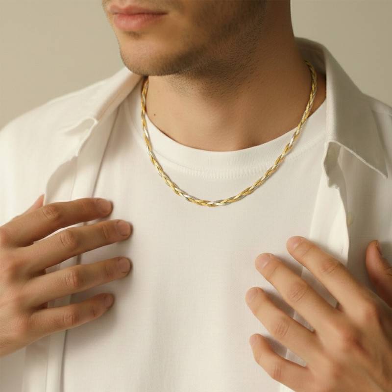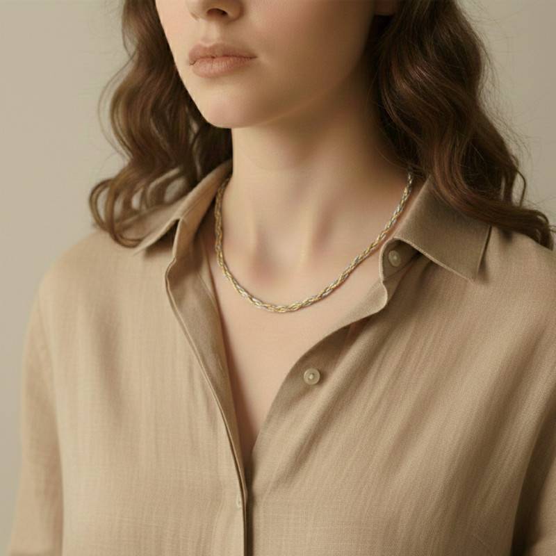 Soyez émerveillés en voyant ce merveilleux collier. Composé de mailles à la finition texturée et polies, il arbore un design en tresse pour une allure encore plus captivante. Conçu en 2 ors 375/1000 (9K), il présente des tons doré et argenté et mesure 46 cm de longueur pour une largeur de 3,50 mm. Ce collier se posera délicatement sur votre cou afin de vous accorder une vive allure quelle que soit votre tenue. Enfin, pour un poids total de 4,50 grammes, vous pourrez le fixer à votre cou à l'aide de son fermoir mousqueton vous offrant un port plus simple et plus pratique.
