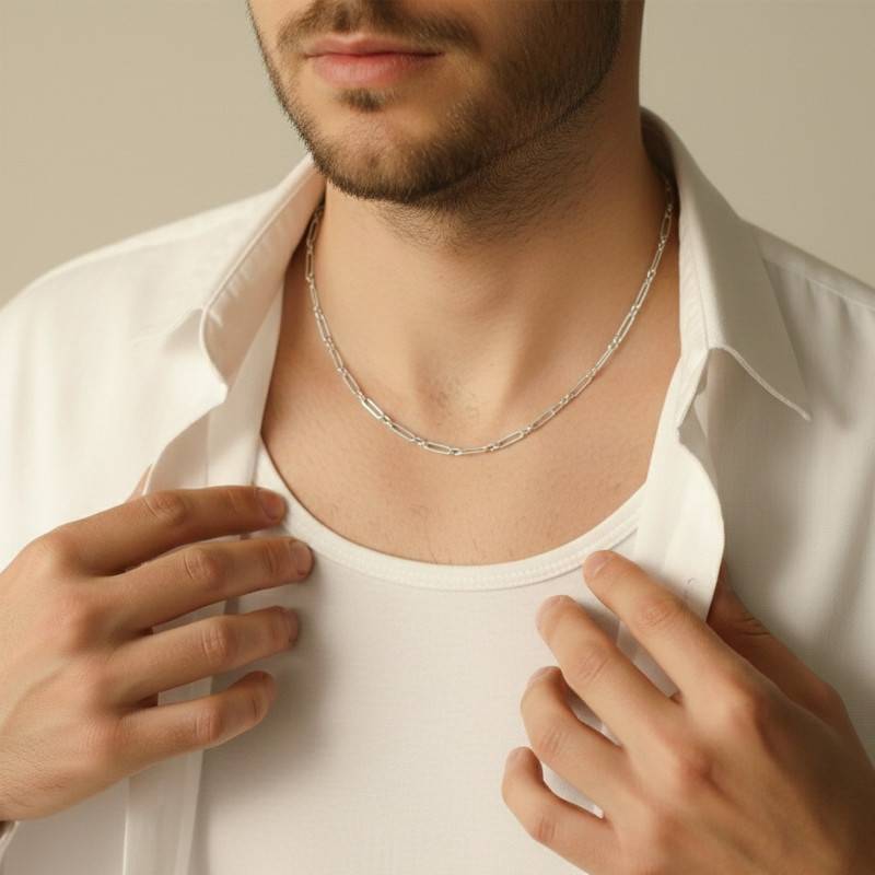 La chaîne Figaro est en maille de type figaro, elle se compose d'une alternance d'une grande maille et de trois autres petites mailles qui sont plus arrondies que les mailles figaro classiques. Ce collier est entièrement en argent massif certifié 925/1000. Pour une longueur de 41,00 cm, son poids total est de 3,30 g. Pour une longueur de 46,00 cm, son poids total est de 3,70 g. Pour une longueur de 51,00 cm, son poids total est de 4,10 g. Le bijou a une largeur de 2,00 mm.
