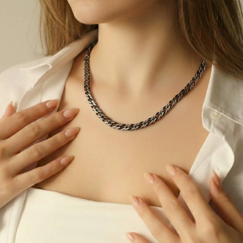 Cette chaîne est en maille double rombo, elle est constituée d'anneaux ovales larges et épais. Elle est certifiée en argent massif 925/1000. Son style en argent oxydé rend cette chaîne très vintage et donnera un vrai plus à votre look. La longueur de ce collier est de 56 cm, sa largeur de 9 mm, pour un poids total de 72 grammes.