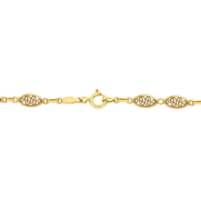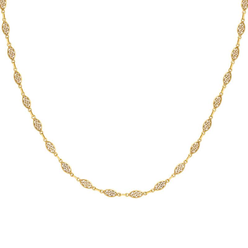 Découvrez cette chaîne distinctive qui se démarque par sa maille filigrane aux maillons ovales et texturés. Façonnée avec soin à partir d'or jaune 375/1000 (9K), elle arbore une finition brillante qui met en lumière la noblesse de l'or. Dévoilant un design exceptionnel et original, elle ajoutera une touche de sophistication à toutes vos tenues. Dotée d'un fermoir anneau à ressort, cette chaîne affiche un poids d'or moyen de 6,50 grammes et dévoile une longueur de 46 cm pour une largeur de 5,20 mm.