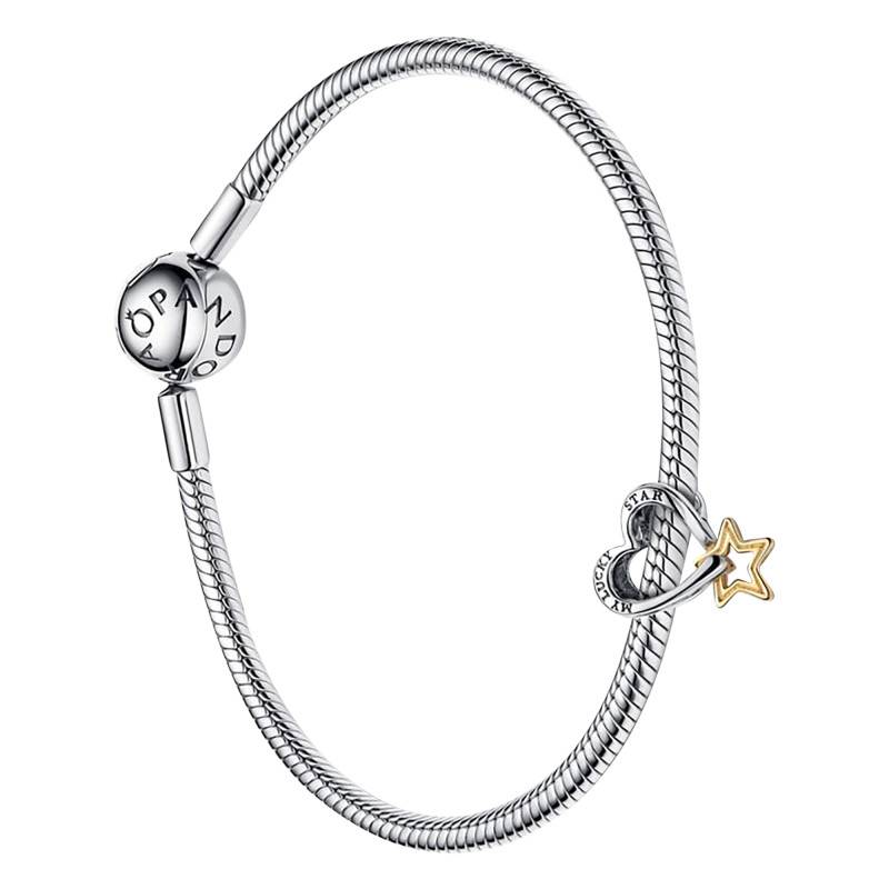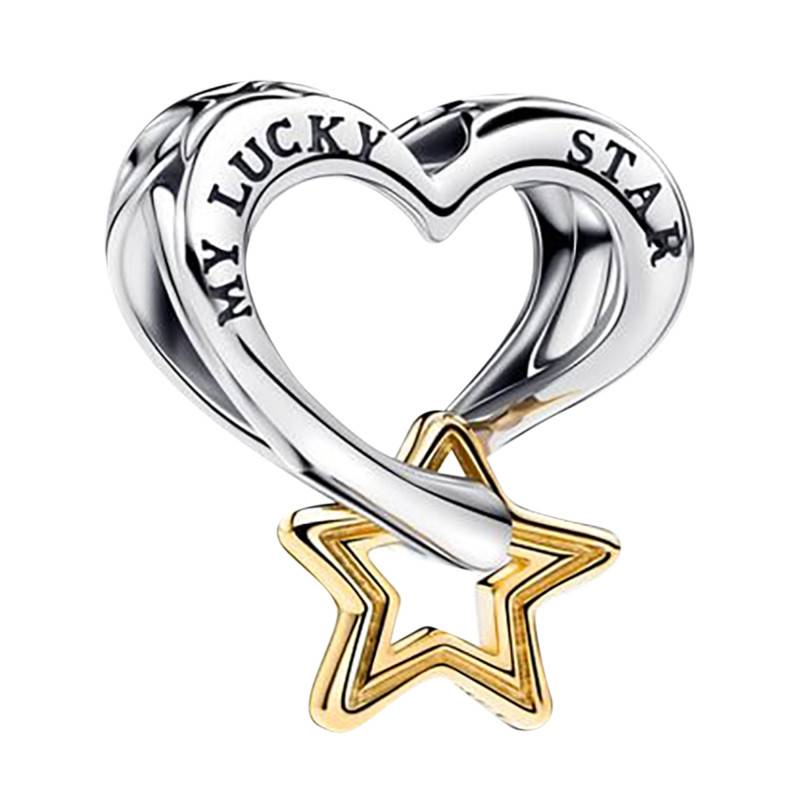 Le Charm Bonne Étoile & Cœur est une pièce ajourée en forme de cœur, confectionnée en argent 925/1000. Il est gravé de l'inscription « MY LUCKY STAR » (MA BONNE ÉTOILE) et agrémenté d'un pendentif en forme d'étoile doré à l'or 585/1000 (14K). Ce charm mesure 13 mm de hauteur, 10,8 mm de largeur et 7,5 mm de profondeur.