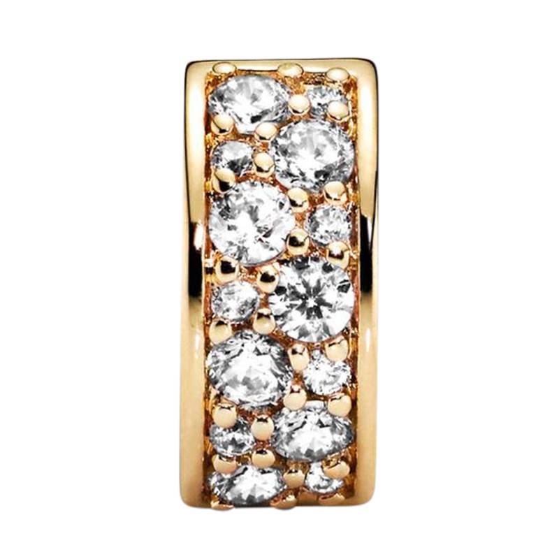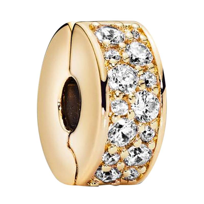Fabriqué en métal doré à l'or jaune 585/1000ᵉ (14K), le Charm Clip Pavé Transparent est orné de délicats oxydes de zirconium cubiques incolores, disposés pour capturer et refléter la lumière avec éclat. Ce charm clip est doté d'une attache en silicone qui le maintient parfaitement en place sur votre bracelet, offrant une flexibilité de positionnement. Avec des dimensions de 10,2 mm de hauteur et 4,8 mm de largeur, il est idéal pour espacer vos charms tout en ajoutant une touche lumineuse et sophistiquée.