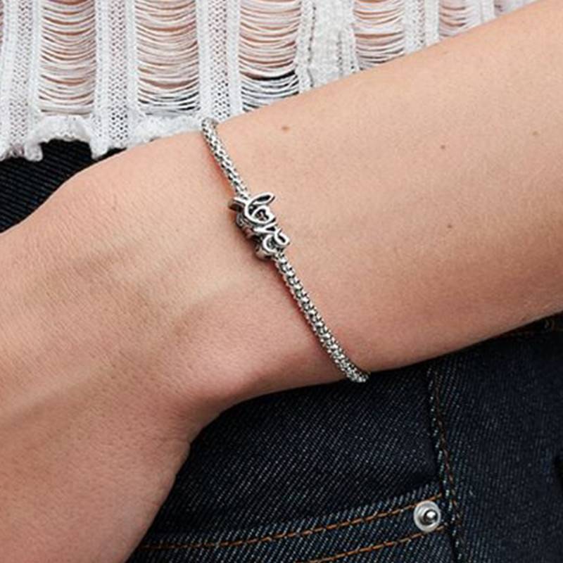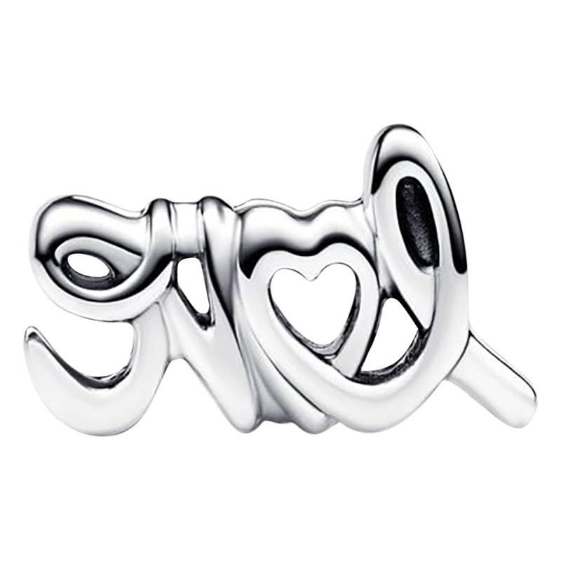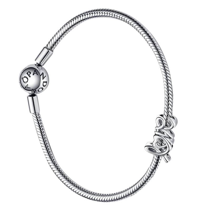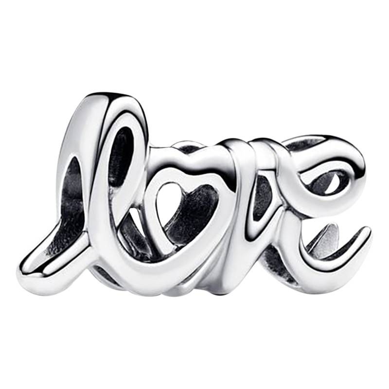 Le Charm Love en Lettres Cursives est confectionné en argent 925/1000. Il présente le mot "love" écrit à la main, avec la lettre "o" en forme de cœur, symbolisant l'amour et l'affection. Ce charm ajouré est conçu pour suivre la ligne de votre bracelet ou de votre bijou à charms. Ses dimensions sont de 8,2 mm de hauteur, 14,1 mm de largeur et 7 mm de profondeur. Il est compatible avec les bracelets et colliers de la collection Pandora Moments.
