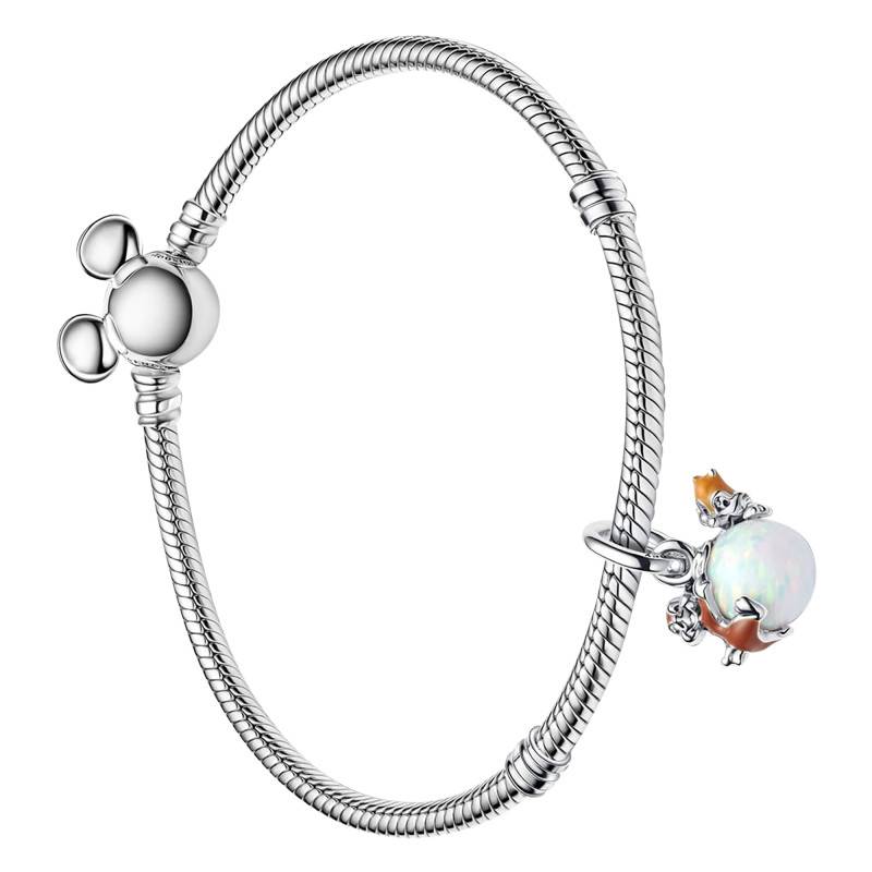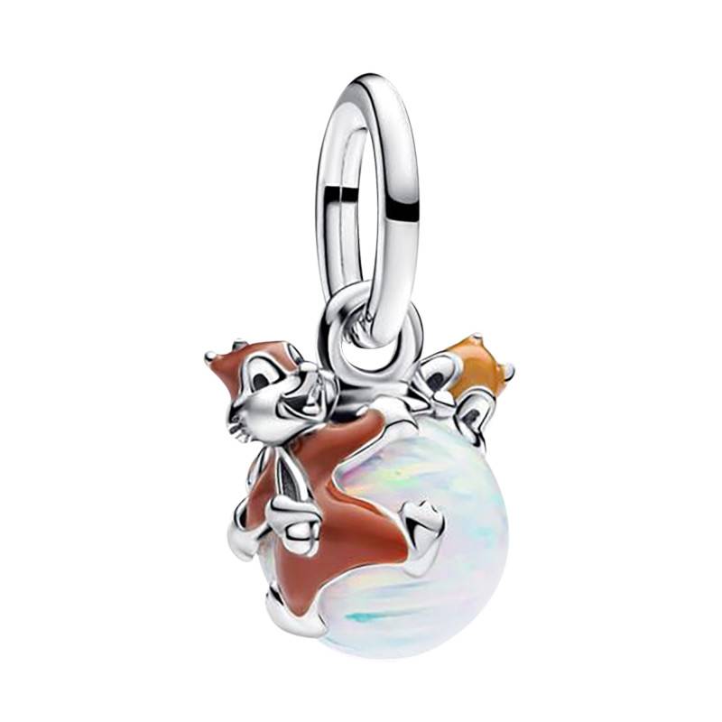 Le Charm Pendant Disney Boule Tic & Tac, fabriqué en argent 925/1000, capture les adorables écureuils dans une boule en verre transparent, donnant l'impression qu'ils s'amusent à l'intérieur. Les détails minutieux, comme leurs expressions faciales rieuses et leurs postures dynamiques, sont sublimés par des touches de résine façon émail appliquée à la main, ajoutant de la couleur et du réalisme. Le contraste entre le métal brillant et la transparence du verre crée un effet visuel unique. Mesurant 12,2 mm de hauteur, 11,4 mm de largeur et 11,2 mm de profondeur, ce charm apporte une touche d'humour et de gaieté à vos bracelets Pandora Moments.