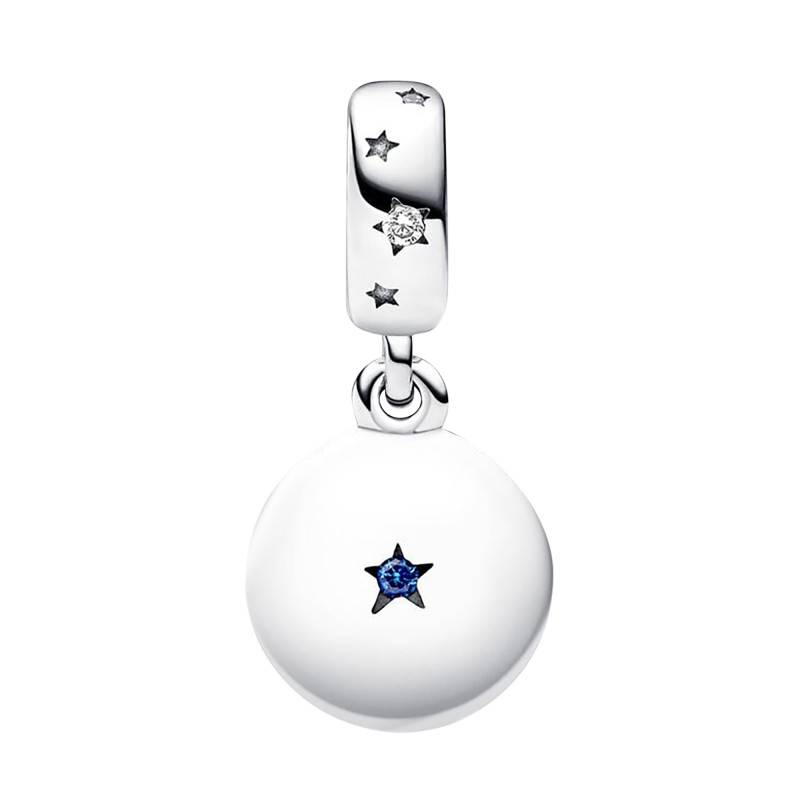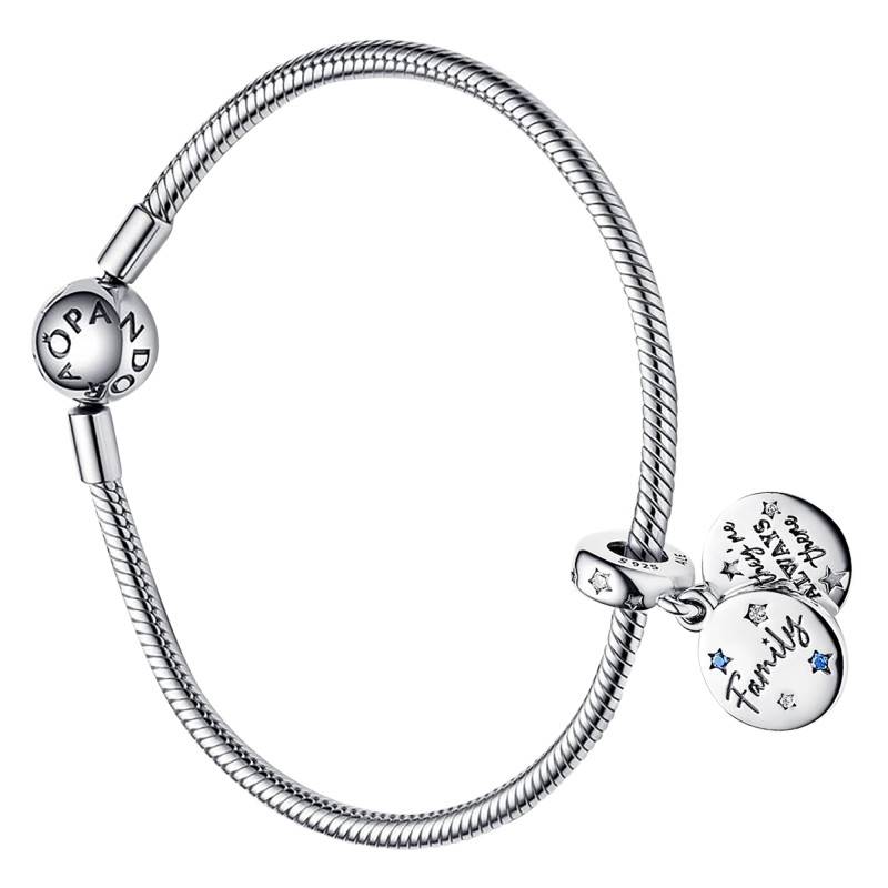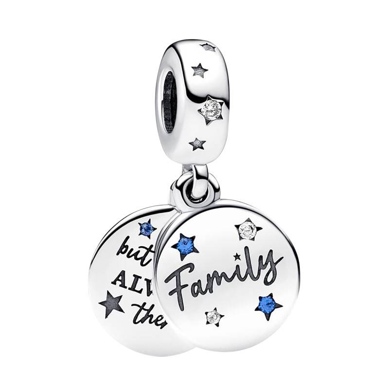 Ce pendentif double en argent 925/1000 se distingue par ses deux disques superposés. Ils sont gravés d'un message touchant : "Family... are like stars, you don't always see them... but they are always there" (La famille, c'est comme les étoiles : on ne les voit pas toujours, mais elles sont toujours là). Le second disque est orné d'un cœur étoilé et de cristaux bleus et transparents qui scintillent délicatement, évoquant la lumière des astres. Avec ses dimensions de 11 mm de hauteur, 11 mm de largeur et 4 mm d'épaisseur, ce charm est parfaitement adapté aux bracelets et colliers Pandora Moments.