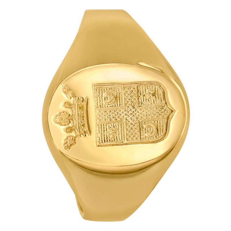 Le plateau de la chevalière mesure 11 x 13 mm. Son aspect lisse et brillant met en avant un blason gravé avec précision qui fait ressortir tous les détails des armoiries avec élégance. Le corps de bague mesure 4 mm de largeur. Pour un tour de doigt 60, le poids d'or de la chevalière est d'environ 7,50 grammes. Le poids d'or pourra légèrement varier en fonction de votre tour de doigt.