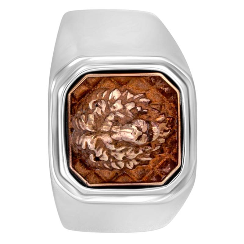 La Chevalière King Acier & Bronze évoque un équilibre harmonieux entre force et délicatesse. Avec une largeur de 5,50 mm, elle s'érige en symbole de distinction. Son plateau, d'une dimension de 14 x 14 mm, est magnifié par un motif animal finement ciselé, sublimé par la teinte chaleureuse du bronze et le lustre sophistiqué de l'argent massif 925/1000. La finition mate brossée ajoute une touche contemporaine. Fabriquée avec passion en France, cette pièce exalte la noblesse des matériaux - acier, argent et bronze.