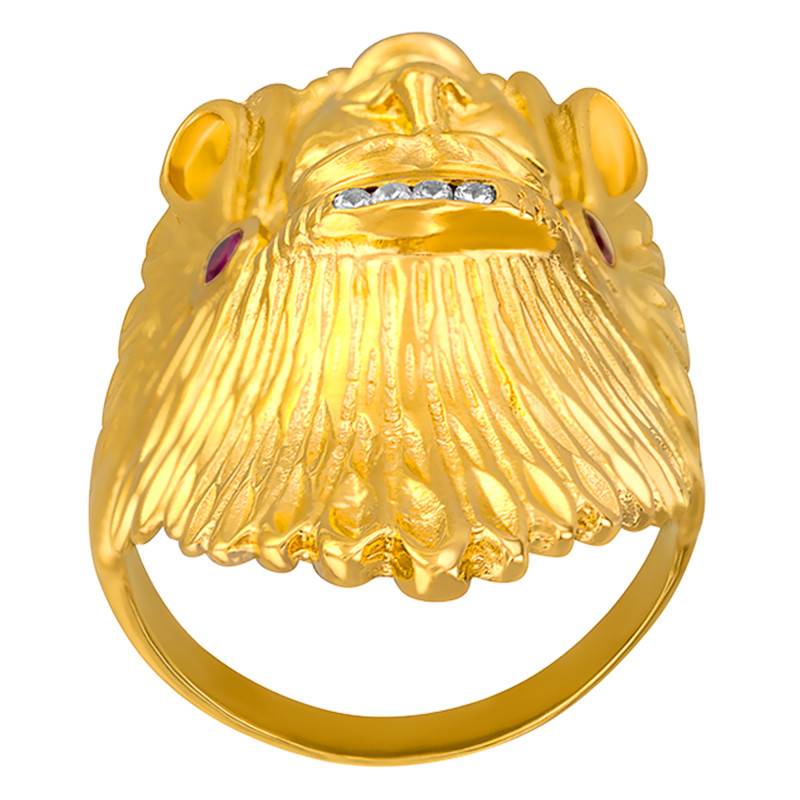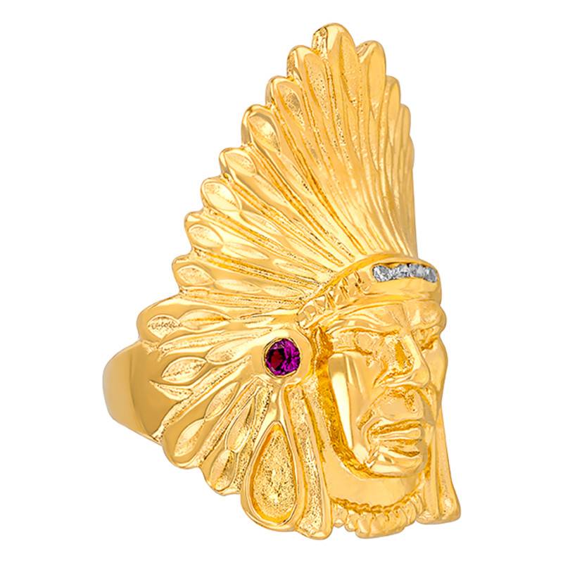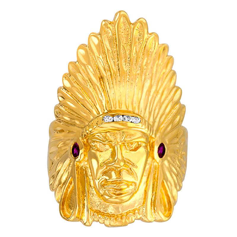 Ocarat a le plaisir de vous dévoiler cette très belle chevalière homme réalisée en or jaune 750/1000 (18K). Elle représente une tête d'Indien de 31,50 x 20,80 mm pour une épaisseur de 7,30 mm. Vous ne saurez résister aux détails bluffants rendant la tête très réaliste. Son corps de bague mesure 5,80 mm de large. Le poids de ce bijou est d'environ 14,50 grammes. Cette chevalière se pare de quatre diamants totalisant 0,02 ct, couleur H et pureté SI, délicatement sertis sur sa couronne. De part et d'autre de la tête, deux rubis ornent ses oreilles avec finesse. C'est une création joaillière à porter sans modération, elle viendra apporter une réelle touche de caractère à votre main.