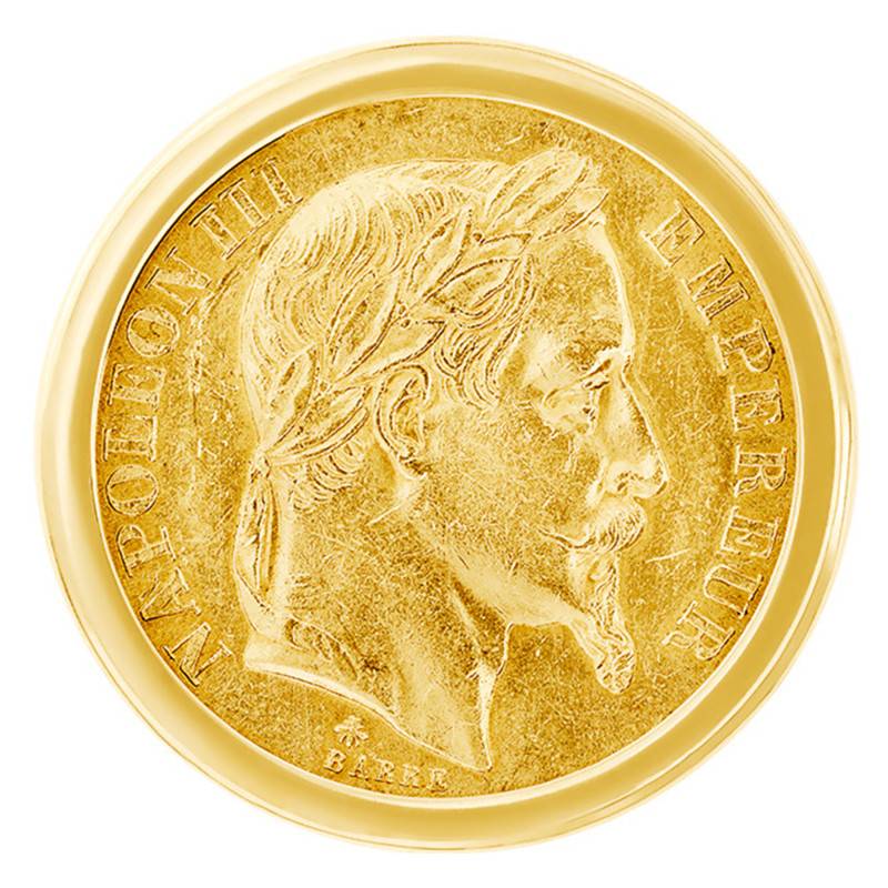 Cette sublime chevalière possède un design élégant et plein de caractère. Le bijou se compose d'or jaune 375/1000 (9K) et d'une pièce de 10 francs Napoléon III en or jaune 22 carats. Cette lumineuse pièce possède un diamètre de 19 mm. Le poids d'or moyen du bijou va varier selon le tour de doigt sélectionné, sans la pièce la bague à une poids d'or moyen de 5,30 grammes pour une taille 60. La pièce de 10F pèse quant à elle 3,20 grammes.