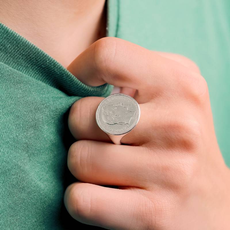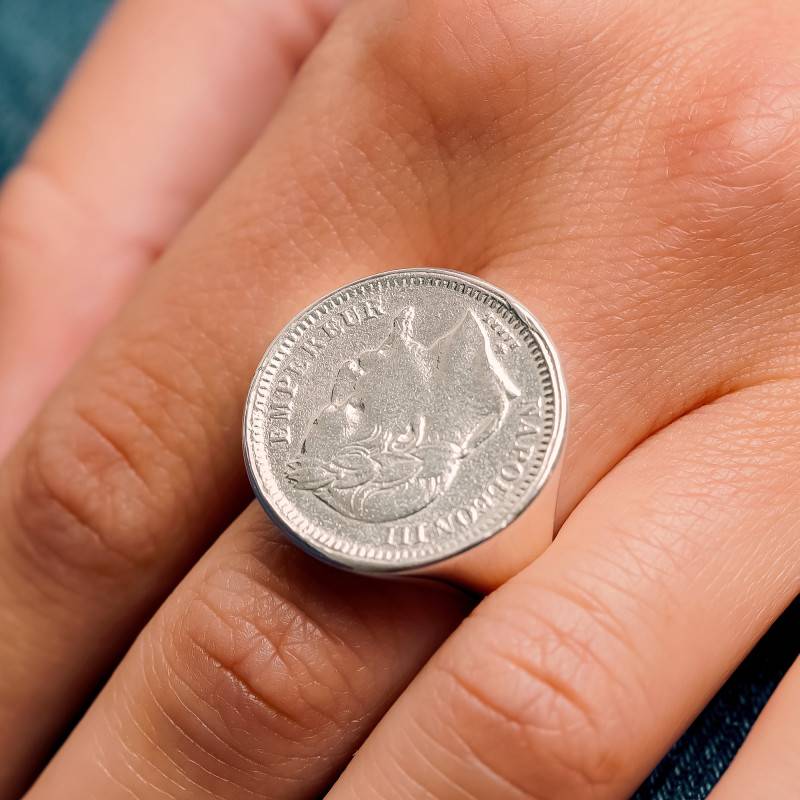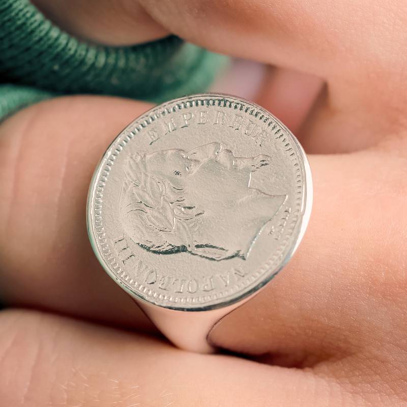 La Chevalière Réplique Napoléon III Pièce 20F en Argent 925 rend hommage à l'histoire et au raffinement. Conçue pour sublimer aussi bien les mains féminines que masculines, elle séduit par son éclat argenté et sa finition polie et brillante. Réalisée en Argent massif 925/1000, cette pièce d'exception présente une épaisseur de 0,50 mm, un diamètre de 21 mm et un poids d'environ 8,00 g pour la taille 60. Le motif de pièce sur le plateau évoque la grandeur de l'Empire, symbole de force et de prestige.
