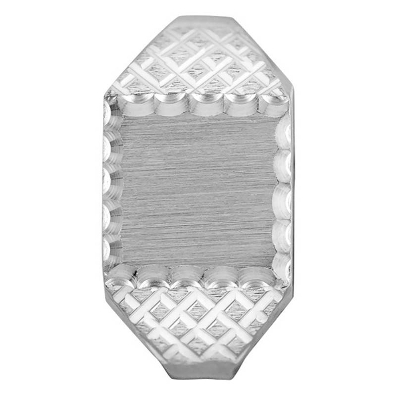 Des rainures sont présentes de chaque côté du plateau. Elles forment des losanges. Il y a un contraste entre les losanges qui sont brossés et les rainures qui sont brillantes. Les dimensions du plateau de la chevalière sont de 10 millimètres par 10 millimètres.