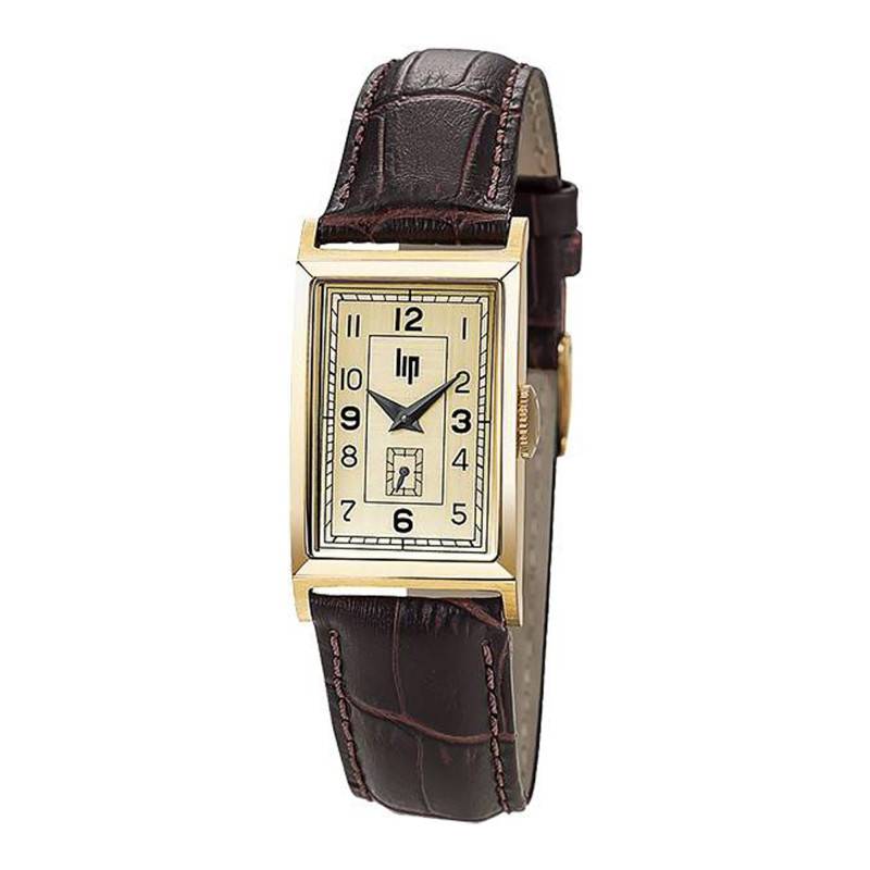 Cette version de la T18 Churchill Gold est équipée d'un boitier en acier avec revêtement PVD Or jaune et d'un cadran champagne à deux tons et de forme rectangulaire. Les deux aiguilles (heures et minutes) ont la forme de flèches et sont de couleur noire, la petite seconde est située sur le compteur excentré à 6h. Ce modèle joli et classique respecte l'esprit authentique de la célèbre maison horlogère Lip.