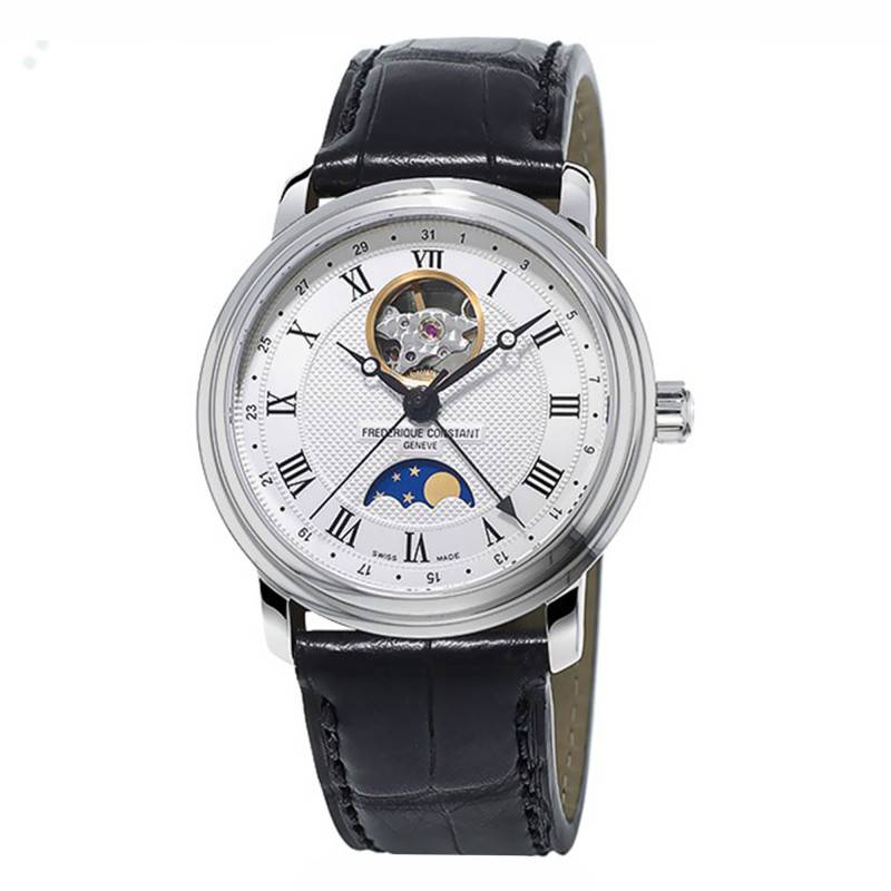 Se logeant au coeur du boitier de ce garde-temps nous retrouvons un mouvement automatique manufacture Frédérique Constant. Ce calibre suisse FC-335 de 26 rubis affiche une fréquence d'oscillation de 28'800 alternances par heure pour une réserve de marche de 38 heures. Les fonctions offertes par ce calibre sont les suivantes : heures, minutes, secondes, phase de lune, date ainsi que Heart Beat sur le cadran.