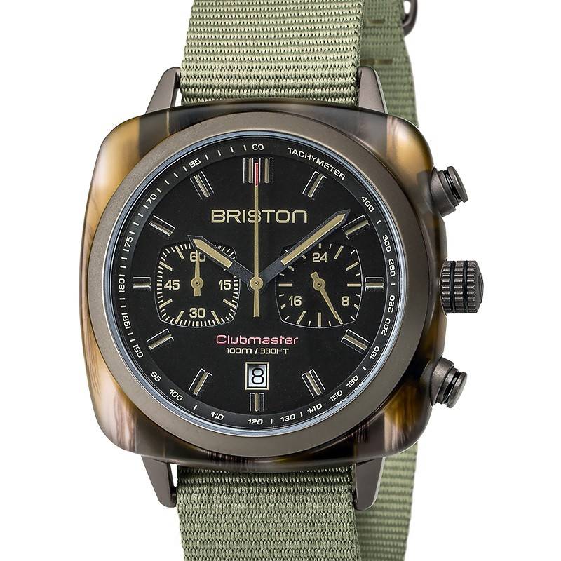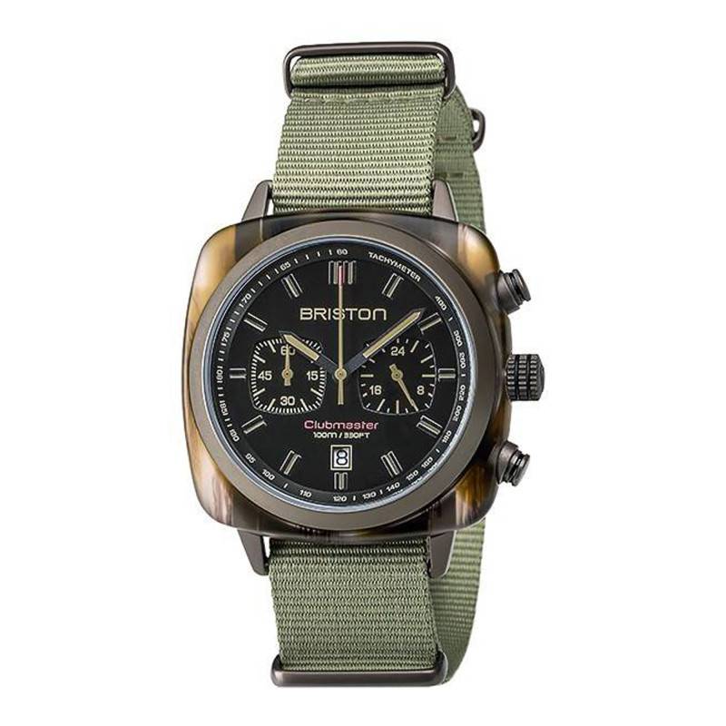Un garde-temps contemporain, chic et résolument décontracté ? Ne cherchez plus et laissez vous séduire par le style sport chic à l'inspiration "british", si propre à la marque française. Pour ce nouveau modèle de la collection Clubmaster Sport, Briston à souhaité s'adresser en particulier aux hommes en recherche d'aventures. Ses couleurs sauvages vertes-kakis seront parfaites au poignet de baroudeurs endurcis. Cette montre chronographe dispose d'un boîtier caractéristique à la forme carronde de 42x42mm et 11,9g fait en acétate de cellulose vert façon "bois" élaboré en Italie, poli à la main et portant une finition mate. Son fond est vissé. Ce modèle à quartz dispose de plusieurs fonctions que vous pourrez apprécier sur son cadran, à travers un verre minéral bombé de 2,3mm d'épaisseur. Ce dernier se voit enlacé d'une lunette en acier inoxydable 316L à la couleur kaki mat obtenue par traitement PVD. Sur son flanc droit, une couronne en acier et PVD kaki gravée du blason Briston et portant deux inserts en caoutchouc est entourée de deux boutons poussoirs.