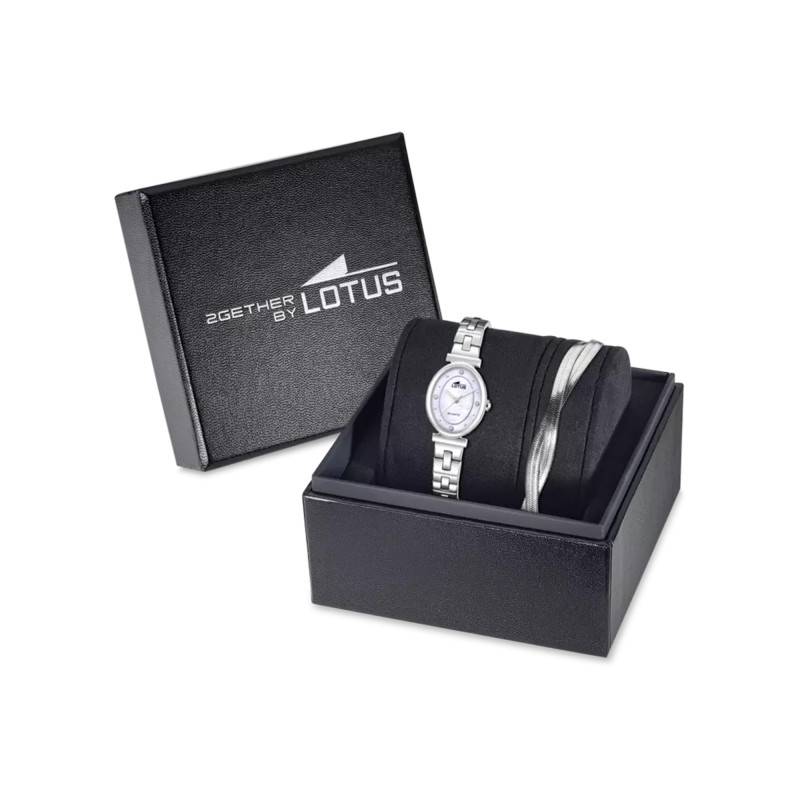Le coffret Montre 2gether proposé par Lotus séduit par son design à la fois moderne et élégant. Il se compose d'une montre femme en acier inoxydable au design délicat et intemporel, accompagnée d'un bracelet coordonné avec la montre, lui aussi en acier inoxydable, le tout soigneusement présenté dans un écrin noir siglé.