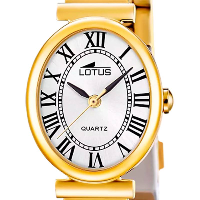 Cette montre Lotus incarne la perfection de l'art horloger moderne. Avec son boîtier ovale en acier inoxydable de couleur dorée, elle se distingue par sa finesse et son profil gracieux. Le diamètre de 23 mm et l'épaisseur de 7,10 mm offrent une dimension parfaite qui épouse harmonieusement le poignet. Le verre minéral plat assure une clarté et une protection de qualité supérieure, tandis que la lunette en acier inoxydable complète l'ensemble avec robustesse et sophistication. Pesant 47 g, elle est suffisamment légère pour ne pas entraver le quotidien tout en demeurant présente.
