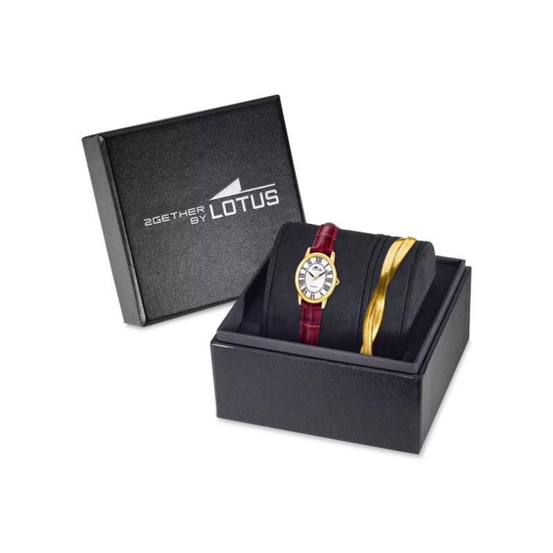 Ce coffret LOTUS Together offre un ensemble féminin et élégant associant une montre et un bracelet doré. La montre se démarque par son bracelet en cuir rouge qui apporte une touche de couleur chaleureuse et raffinée. Le cadran blanc avec ses index dorés crée un bel équilibre visuel, tandis que le boîtier doré fait écho au bracelet doré qui complète harmonieusement la parure. Présenté dans l'écrin signature noir de la collection avec le logo "Together by LOTUS" gravé sur le couvercle, cet ensemble bénéficie d'un écrin intérieur en velours sombre qui sublime les teintes dorées et le rouge profond du bracelet en cuir.