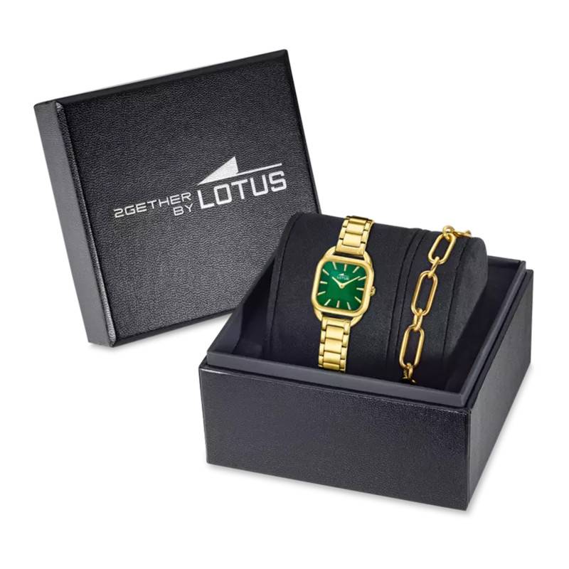 Ce coffret Lotus 2gether séduit par son style contemporain et parfaitement équilibré. Il réunit une montre femme en acier inoxydable aux finitions soignées, mise en valeur par un cadran vert lumineux apportant une touche de caractère et d'originalité. L'ensemble est présenté dans un écrin noir élégant, discrètement marqué du logo Lotus, conçu pour protéger et sublimer la montre.