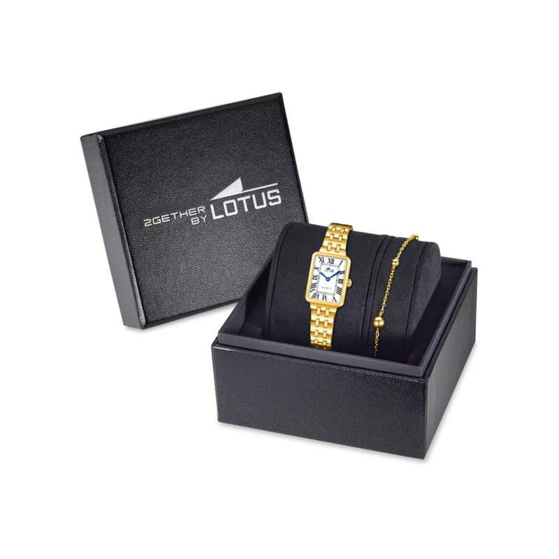 Ce coffret Lotus 2gether met en scène un ensemble doré éclatant composé d'une montre rectangulaire et d'un bracelet assorti. La montre séduit par son cadran blanc orné de chiffres romains noirs qui lui donnent un caractère classique et raffiné. Un délicat bracelet bijou doré accompagne la montre, créant un ensemble parfaitement coordonné pour illuminer le poignet.