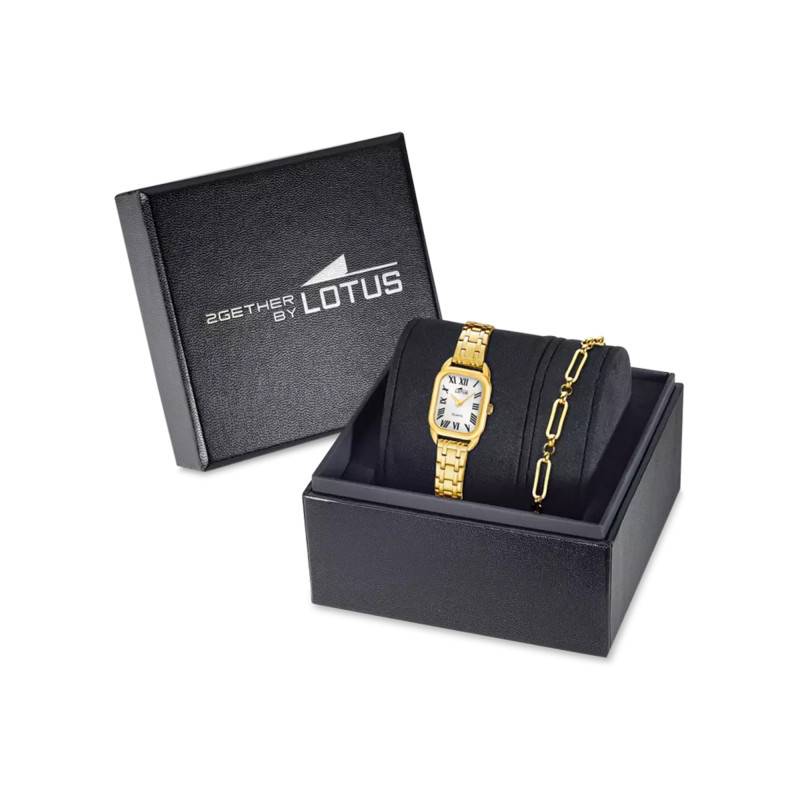 Ce coffret Lotus 2gether révèle un ensemble doré raffiné composé d'une montre rectangulaire et d'un bracelet assorti. La montre affiche un cadran blanc crème orné de chiffres romains noirs qui lui confèrent un caractère classique et intemporel, rehaussé par des aiguilles bleues élégantes. Un bracelet chaîne doré aux maillons géométriques modernes vient parfaire l'ensemble, créant une harmonie parfaite entre tradition et contemporanéité.