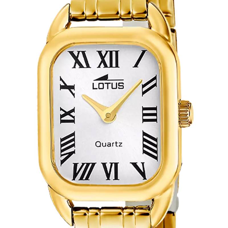 Le bracelet de cette montre Lotus se distingue par sa conception en acier inoxydable de couleur dorée, harmonieusement assortie au boîtier. Sa finition polie sublime le bracelet avec une brillance accentuée, captant la lumière de manière raffinée. La largeur de l'entrecorne est de 12 mm, un choix qui garantit un port confortable et une stabilité sur le poignet, essentiels pour un usage au quotidien. De plus, le bracelet est doté d'une boucle déployante, offrant une sécurité renforcée et une praticité sans égale lors de la fermeture et l'ouverture.