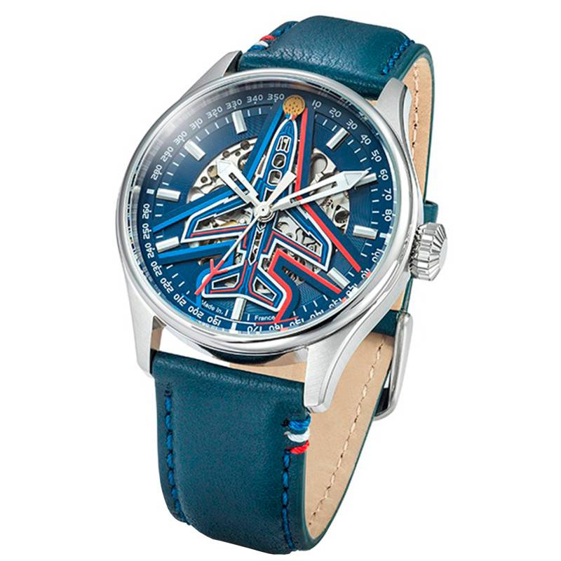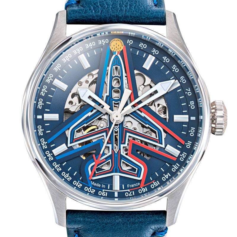 Cette création horlogère capture l'essence même de l'aviation avec son design inspiré de l'Alphajet emblématique de la Patrouille de France. Le cadran de cette montre se démarque par sa finition squelettée, permettant d'apprécier le subtil mécanisme à l'œuvre. Orné d'une couleur bleue, il incarne parfaitement l'esprit d'élégance et de modernité. Les aiguilles sont luminescentes, tout comme les index, garantissant une visibilité optimale en toutes circonstances. Le design du cadran est innovant, complétant parfaitement le caractère unique de ce garde-temps avec son bout de trotteuse en forme d'alphajet, un hommage parfait à l'aviation française.