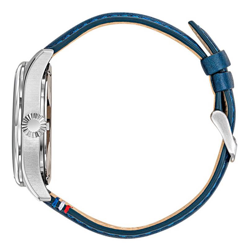 Le bracelet en cuir de vachette bleu confère à cette montre une sophistication supplémentaire. Sa largeur de 22 mm garantit un port confortable et sûr grâce à une boucle ardillon résistante et élégante. Ce bracelet intègre parfaitement le style de la montre, en résonance avec sa teinte bleue et ses coutures précises. E