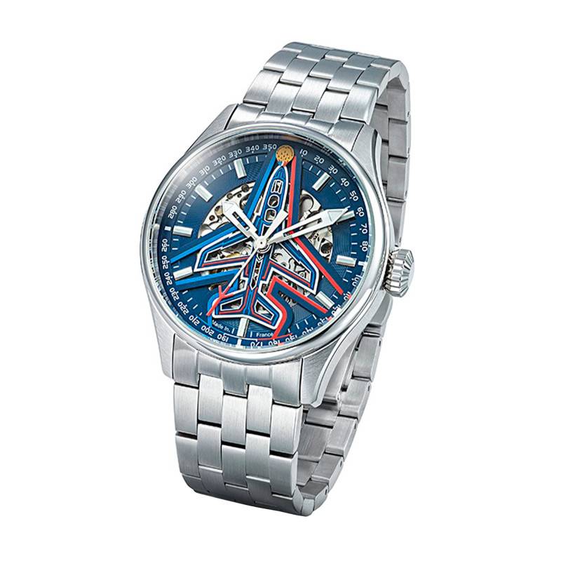 Le cœur de cette montre réside dans son cadran bleu à finition squelette, révélant la forme de l'emblématique Alphajet utilisé par la Patrouille de France. Ce cadran laisse entrevoir la danse synchronisée des rouages élégamment agencés. Les index et les aiguilles luminescents facilitent la lecture, même en conditions de faible luminosité, et ajoutent un aspect fonctionnel essentiel. Le design audacieux est renforcé par une pointe de trotteuse en forme d'alphajet, hommage à l'admirable précision et au patrimoine aéronautique de la Patrouille de France. Ce cadran, protégé par un verre minéral plat, est non seulement une œuvre d'art technique, mais aussi un symbole de style et d'audace.