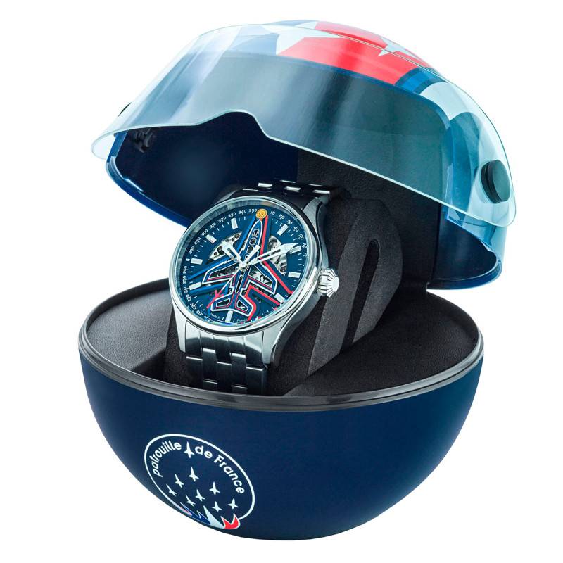 Livré dans un écrin en forme de casque de pilote aux couleurs de la Patrouille de France, ce modèle associe une inspiration aéronautique à la rigueur française. Son boîtier rond en acier inoxydable présente un diamètre généreux de 42 mm, parfaitement en ligne avec les tendances actuelles. Les finitions brossées et polies lui confèrent un caractère résolument moderne et viril. Fabriquée en France, cette montre incarne la robustesse et la finesse à travers un design soigneusement conçu. Le fond de boîte transparent offre une vue hypnotisante sur le mécanisme interne, renforcé par un fond vissé garantissant une étanchéité considérable de 10 ATM, équivalent à une immersion à 100 mètres de profondeur. Cet aspect technique rend la montre résistante aux activités aquatiques quotidiennes, tout en respectant une élégance typiquement française.