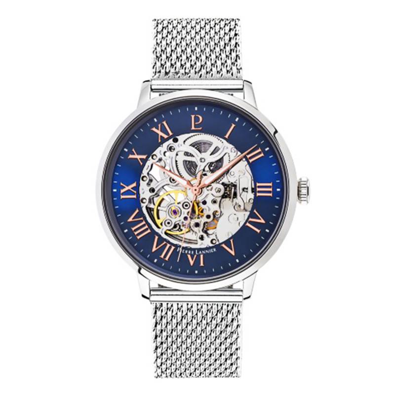 Un cadran de forme ronde complète le modèle. Il présente tout d'abord un double cercle. Le cercle interne fait la magnificence de la montre par sa finition squelette, vous laissant ainsi admirer le mécanisme en mouvement. Le cercle externe dévoile une couleur bleue à la finition soleillée. Des chiffres romains de couleur rose gold ornent le pourtour du cadran et servent de marqueurs temporels. Ils sont rejoints par un chemin de fer des minutes teinté de blanc. Les initiales de la maison Pierre Lannier prennent place à l'index de douze heures. Au centre du cadran se trouvent les trois aiguilles de couleur or rose. Deux aiguilles dauphines au revêtement luminescent indiquent les heures. La fine trotteuse, quant à elle, indique les secondes. Enfin, la marque horlogère appose sa signature à six heures.