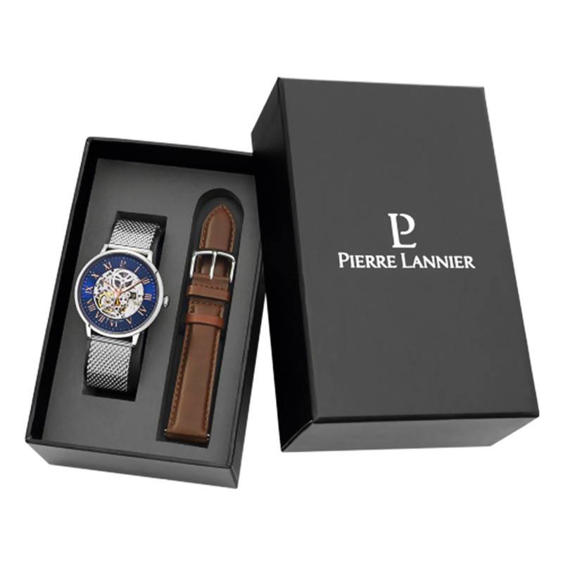 La maison horlogère Pierre Lannier dévoile un coffret masculin élégant et intemporel. Il se compose de deux bracelets interchangeables et d'une montre au design unique. La pièce horlogère possède un boîtier en acier inoxydable de forme ronde. Il présente une finition polie élégante et mesure 42mm de diamètre. Il s'agit là d'une taille parfaite pour les poignets masculins. De plus, un verre minéral vient protéger le cadran de la poussière mais également des chocs. Une couronne remontoir loge traditionnellement à trois heures et vous permet d'ajuster les aiguilles du cadran. Pour finir, le fond de boîte est emboîté et transparent et assure une étanchéité de 3 ATM soit 30 mètres.