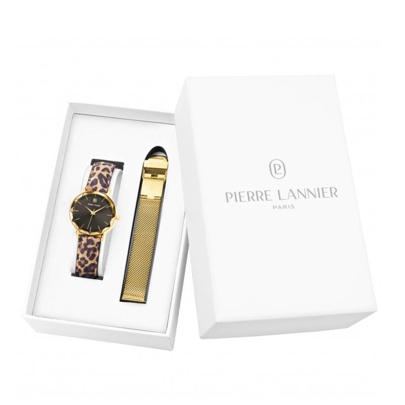 Ce superbe coffret de Pierre Lannier, un nom synonyme d'élégance à la française, propose une montre pour femme résolument moderne et raffinée. Le boîtier, de forme ronde, est fabriqué en acier inoxydable, reconnu pour sa durabilité et sa résistance à la corrosion, et arbore une somptueuse finition en PVD jaune. Avec un diamètre de 30 mm et une épaisseur de 7,3 mm, ce garde-temps offre des proportions idéales pour un poignet féminin.