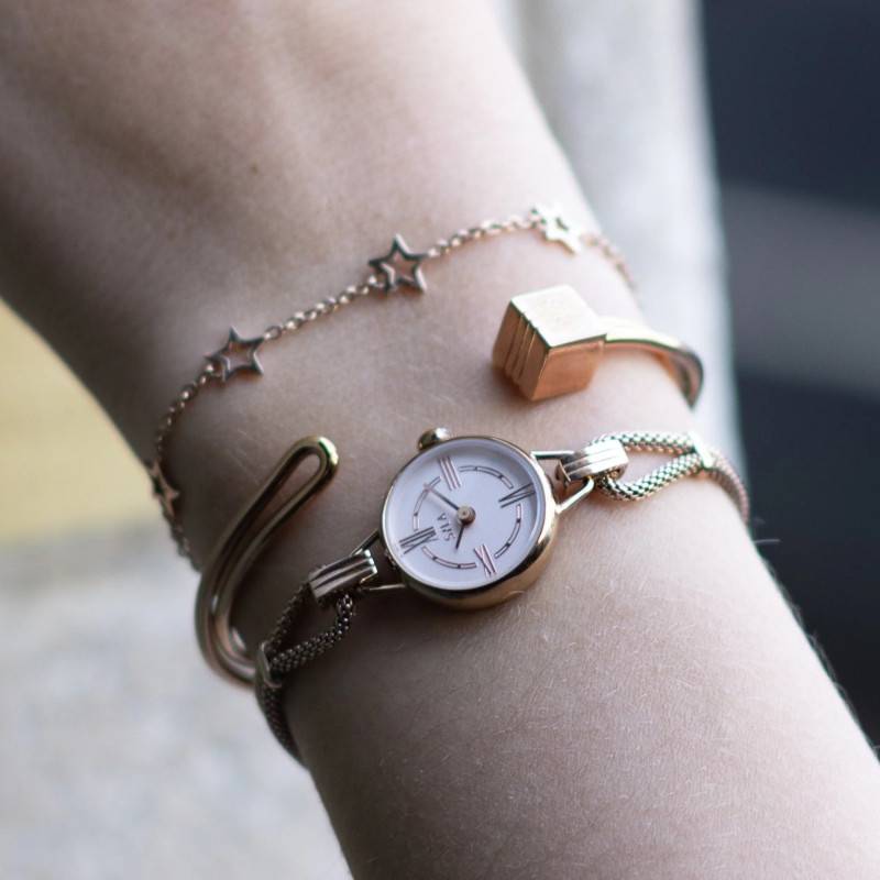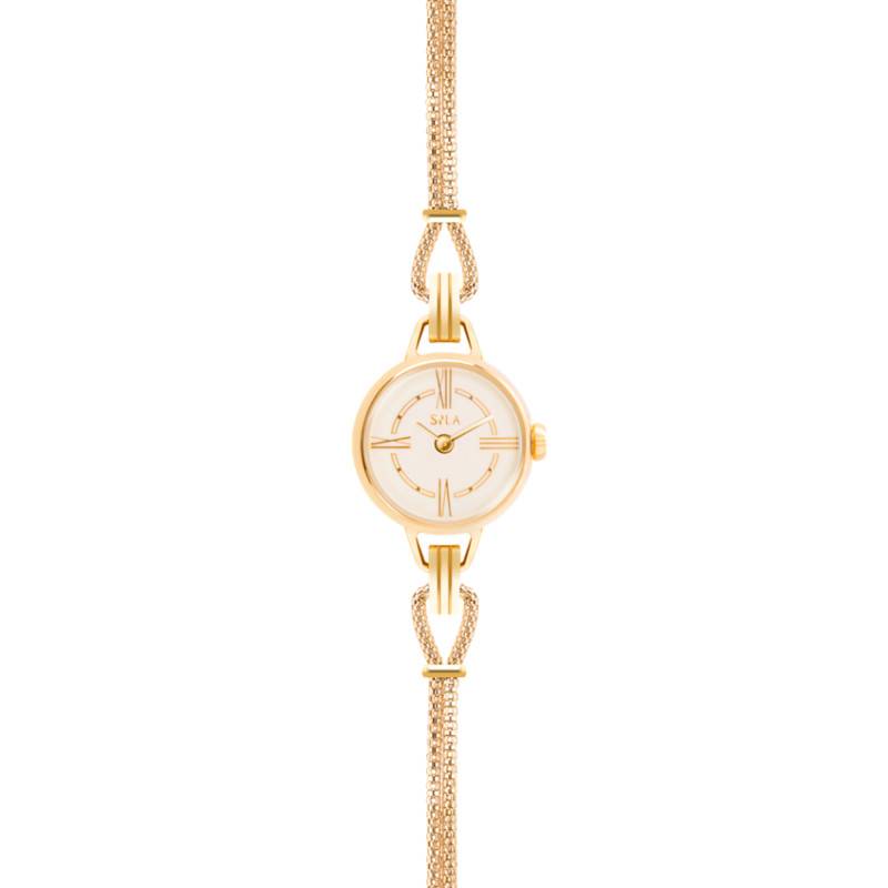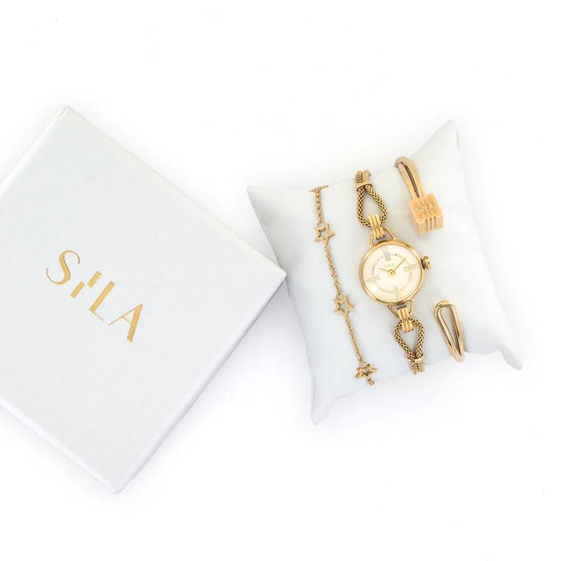 Depuis quelques années, les créations de la marque Sila ne cessent de charmer les femmes qui aiment accumuler les bijoux et les garde-temps sur leurs poignets. Cette entreprise a développé une gamme de bijoux qui sont parfaitement accordés avec leurs montres. Les modèles de Sila célèbrent leur savoir-faire et sont capables de vous embellir en tout temps. Elle a le plaisir de vous présenter ce superbe coffret composé d'une somptueuse montre, d'un bracelet star et d'un jonc. Un ensemble pour femme qui arbore une couleur dorée, symbole de richesse et d'élégance.