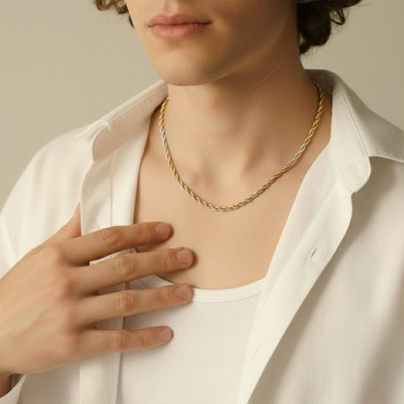 Ce charmant collier chaîne en maille corde torsadée est conçu en or jaune et en or blanc 375/1000 (18K). D'une longueur de 50 cm et d'un poids de 1,80 gramme, ainsi que d'une largeur de 2,20 mm, il habillera délicatement votre cou et apportera une touche de lumière à toutes vos tenues. Grâce à son design bicolore, vous pourrez l'associer facilement à vos autres bijoux afin de sublimer votre look au quotidien. Il sera facile à manipuler et à porter grâce à son fermoir mousqueton.