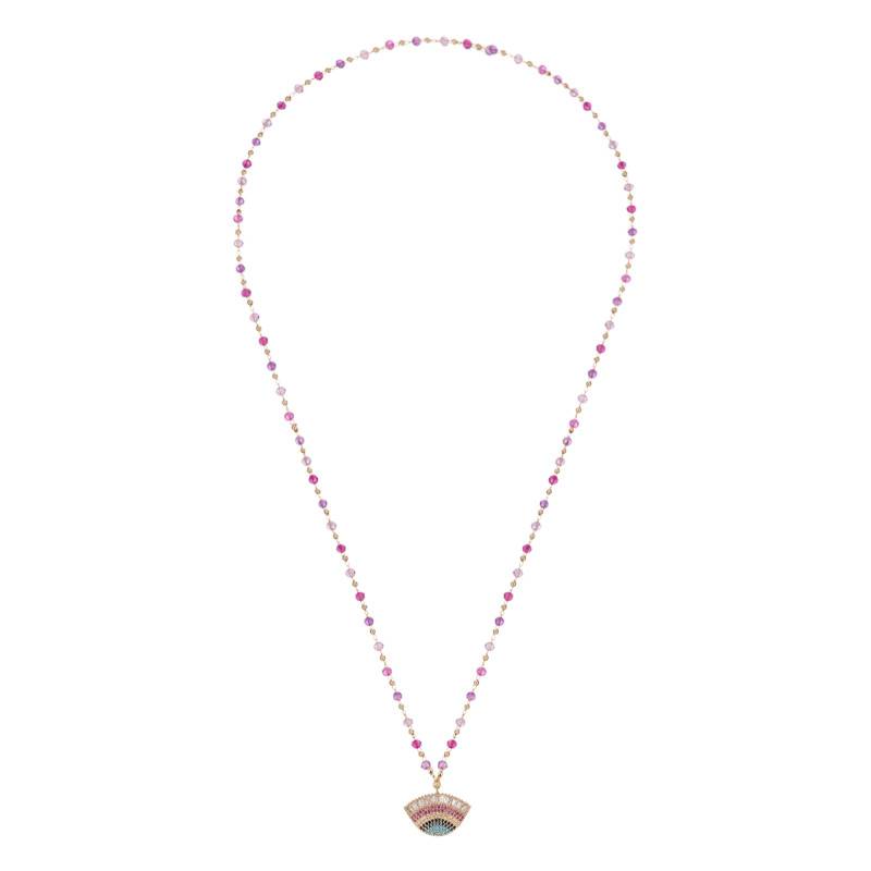 Ce ravissant collier Cleopatra se compose d'une chaîne avec des motifs conçus en cuivre doré à l'or fin 585 reflétant une belle brillance. Ceux-ci sont en alternance avec des perles affichant différentes couleurs. Cette chaîne dispose d'une longueur de 50 cm ajustable à 45 cm et porte un magnifique pendentif en forme d'éventail. Raffiné, il est entièrement serti de zircons multicolores renforçant la belle allure de la création.