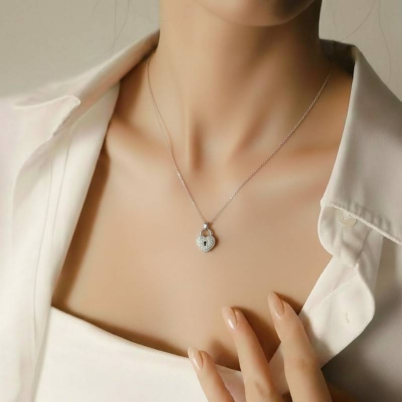 Fascinant et attrayant, ce collier en or blanc 375/1000 (9 K) représente l'élégance douce qui sublimera les regards. Il est formé d'un ensemble de mailles de 0,5 mm chacune qui composent une chaine de 42 cm de longueur avec un poids de 1,60 gramme. Celle-ci comporte un ravissant motif cadenas prenant la forme d'un cœur. Ce dernier est encastré en totalité avec des pierres en oxyde de zirconium dont la brillance révèle toute la beauté. Ce motif mesure 12 mm de largeur, 9,30 mm de hauteur et 1,35 mm d'épaisseur.
