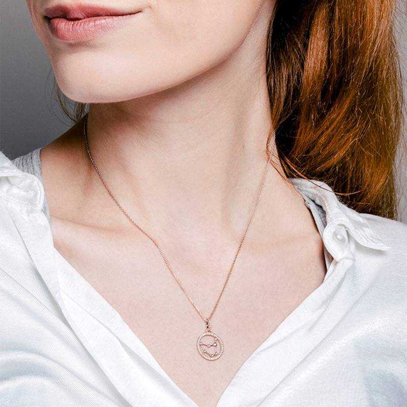 Ce magnifique collier capricorne de couleur rose dorée comprend une maille forçat . Doté d'une finition polie, ce bijou en or rose 750/1000 (18K) possède 56 diamants brillants d'un poids total de 0,17 carat qui sont sertis clos et à grains. Ces pierres blanches, dotées d'une couleur GH et d'une pureté SI, sont incrustées sur la bélière ovale et sur le pendentif rond de ce collier. Ce dernier arbore le signe astrologique du capricorne qui témoigne de la vulnérabilité, mais avec une ambition immense. Notez que ce collier dispose d'un poids d'or moyen de 2,30 grammes et se ferme via un anneau à ressort.