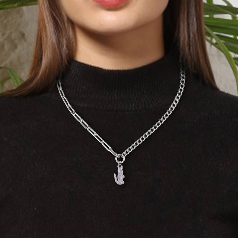Le Collier Crocodile en Acier Inoxydable avec Cristaux se distingue par sa silhouette unique. Pensé pour la femme assurée et audacieuse, ce collier arbore une longueur raffinée de 42 cm, sublimée par l'éclat et la robustesse de l'acier inoxydable 316L. Ses nuances délicates de gris et de rose captent la lumière à chaque mouvement. Équipé d'un fermoir mousqueton, il allie sécurité et élégance.