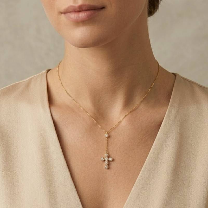 Collier Croix en Or Jaune 375 & Oxydes de Zirconium, Longueur 43 cm Ajustable