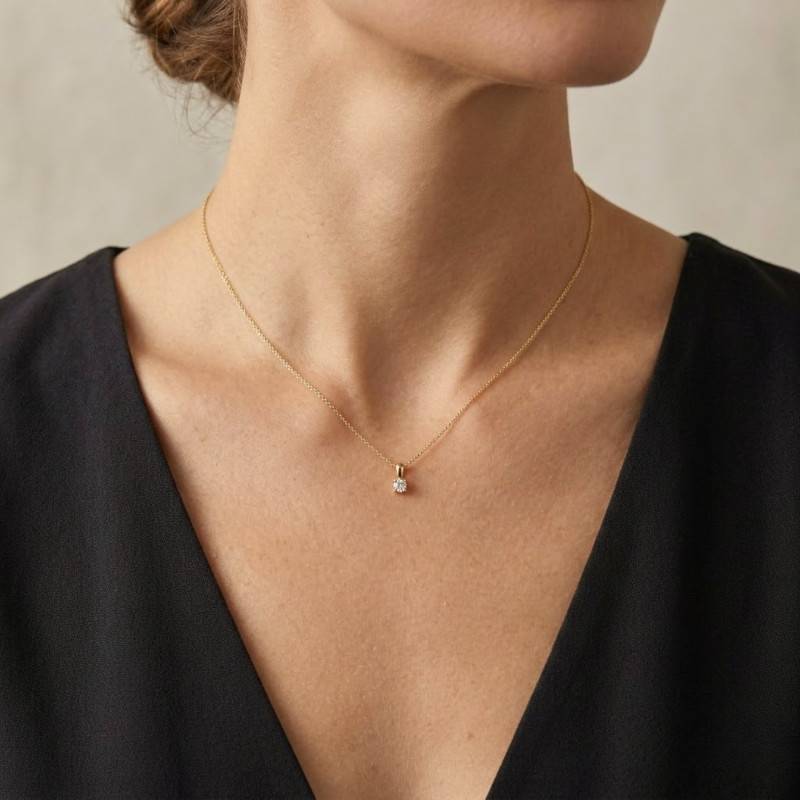 Découvrez le Collier Diamant de Synthèse 4 Griffes 0,09 ct en or jaune 375/1000 (9 carats) ou 750/1000 (18 carats). Ce modèle raffiné est orné d'un diamant de synthèse cultivé en laboratoire, présentant une couleur F et une pureté VVS2, mis en valeur par un serti 4 griffes qui maximise son éclat. La chaîne, à la finition polie et brillante, est ajustable de 40 à 42 cm pour s'adapter parfaitement à votre cou. Le poids total est d'environ 1,40 g en 9K et 2,00 g en 18K. Le collier est équipé d'un fermoir mousqueton assurant un maintien sûr au quotidien.