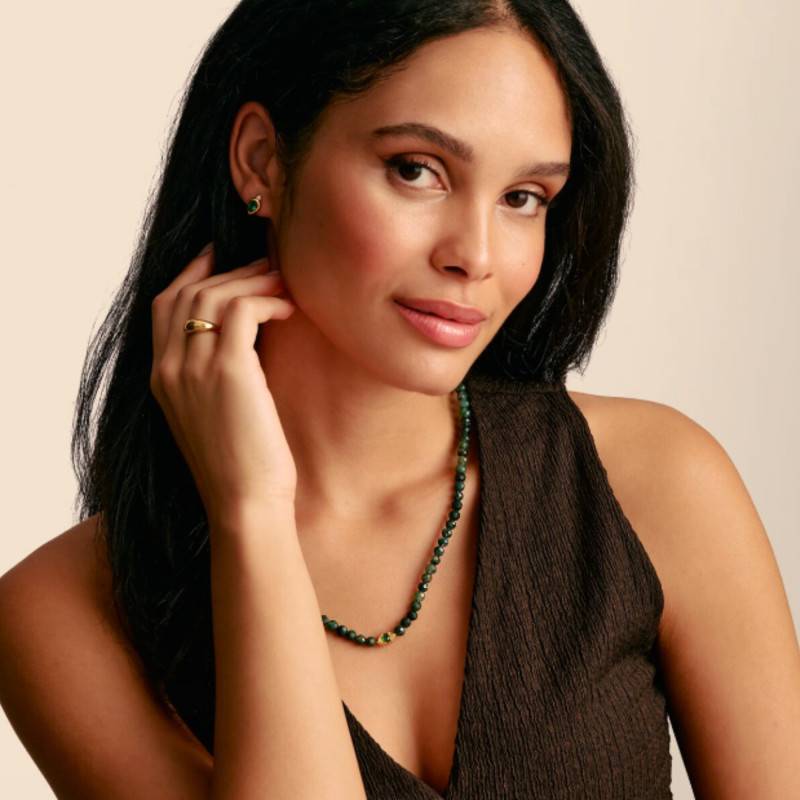Le Collier Elyndra Oeil se déploie comme une symphonie de couleurs et de matières nobles. Confectionné en Argent massif 925/1000 et sublimé par un plaquage Or jaune 750/1000, ces matériaux illustrent un mariage parfait entre modernité et tradition. L'éclat des agates vertes s'unit au scintillement mystérieux de la gemme vitro-céramique verte, dansant avec une lumière envoûtante. Ce bijou, d'une longueur de 55 cm, présente une largeur de 12 mm, une épaisseur de 6 mm, et une hauteur de 7,5 mm, évoquant harmonie et grandeur. Avec sa finition polie et brillante, il s'impose comme un trésor de féminité.